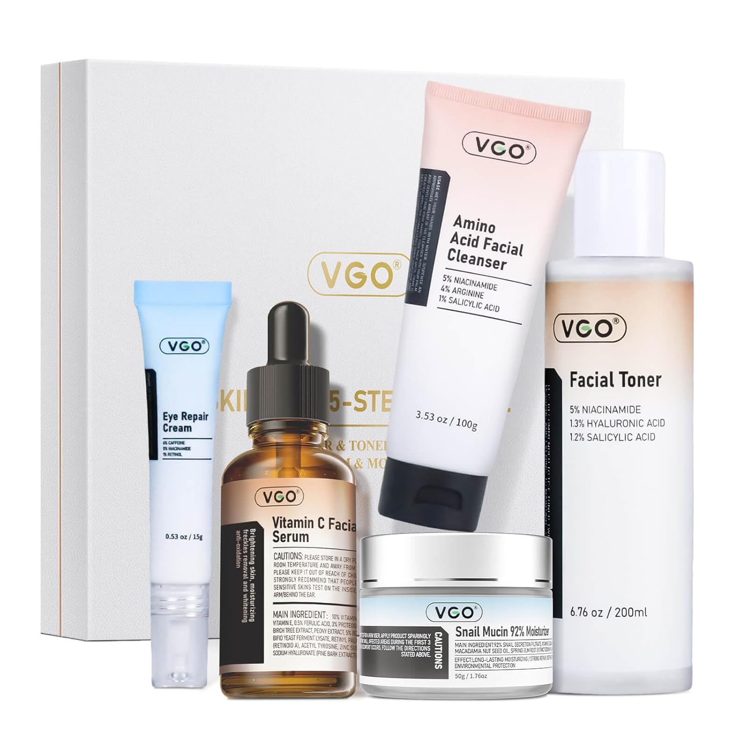 I’ve used the VGO Skin Care Set (cleanser, toner, vitamin C, under‑eye cream, snail mucin moisturizer) for about a month. The routine feels cohesive and the products are gentle. The snail mucin moisturizer is lightweight and helps seal in hydration without heavy greasiness.